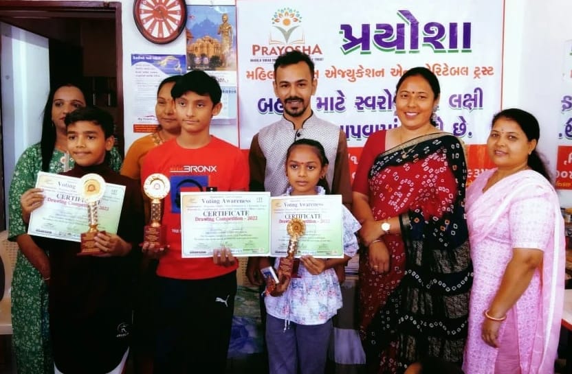 વિધાનસભાની ચૂંટણીને અનુલક્ષીને આજની યુવા પેઢી વધુમાં વધુ મતદાન કરે એ માટે પ્રયોશા મહિલા વિકાસ એજ્યુકેશન એન્ડ ચેરીટેબલ ટ્રસ્ટ અને ગાંધીનગર ટેક્વોન્ડો એસોસિએશન – મિલાપ ટાટારિઆ દ્વારા સેક્ટર-૧૩/એ ખાતે મતદાન જાગૃતિ ના વિષય પર ચિત્ર સ્પર્ધાનું આયોજન કરવામાં આવ્યું હતું. આ સ્પર્ધામાં ગાંધીનગરના બાળકોએ ઉત્સાહભેર ભાગ લીધો હતો. ભાગ લેનાર તમામ સ્પર્ધકો પોતાની કલા અને આવડત વડે મતદાન જાગૃતિ ના વિષય પર ચિત્ર દોરી અનેક સંદેશો આપી રહ્યા હતા અને પ્રયોશા મહિલા વિકાસ એજ્યુકેશન એન્ડ ચેરીટેબલ ટ્રસ્ટના લક્ષ્મી જોષી નો વિશેષ સહયોગ રહ્યો હતો. સ્પર્ધામાં પ્રથમ વિજેતા વૈદિક જૈન, દ્વિતીય વિજેતા હાર્દ વસાવડા અને તૃતીય વિજેતા તુલસી ઠાકોર રહ્યા હતા. વિજેતાઓને ટ્રોફી આપી સન્માનિત કરવામાં આવ્યા હતા તથા ભાગ લેનાર તમામ સ્પર્ધકોને પ્રમાણપત્ર અને ઇનામો આપી પ્રોત્સાહિત કરવામાં આવ્યા હતા ત્યારે આયોજક મિલાપ ટાટારિઆએ જણાવ્યું હતું કે, મતદાનની પવિત્રતા અને રાષ્ટ્રના ઘડતર માટે એક એક મત અમુલ્ય છે માટે ગાંધીનગરના પ્રત્યેક નાગરિકે પવિત્ર ફરજ સમજીને મતદાન કરવું જોઇએ.