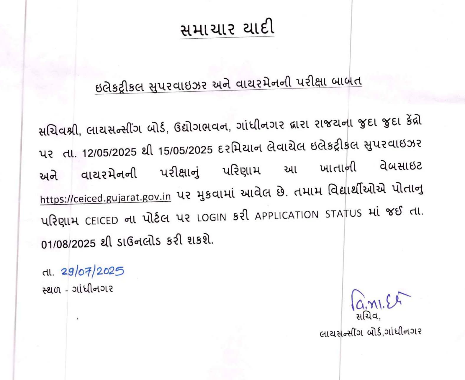ગાંધીનગર: લાયસન્સિંગ બોર્ડ, ઉદ્યોગભવન, ગાંધીનગર દ્વારા આજે ઇલેક્ટ્રિકલ સુપરવાઈઝર અને વાયરમેનની પરીક્ષાનું પરિણામ જાહેર કરવામાં આવ્યું છે. રાજ્યભરના વિવિધ કેન્દ્રો પર ગત ૧૨ મે, ૨૦૨૫ થી ૧૫ મે, ૨૦૨૫ દરમિયાન આ પરીક્ષાઓનું આયોજન કરવામાં આવ્યું હતું.