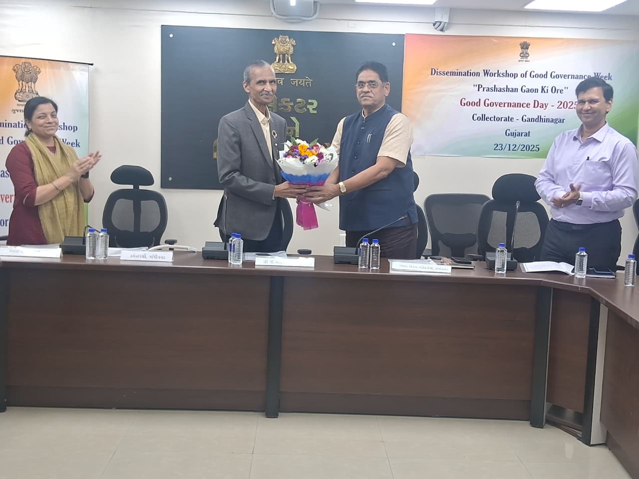 સુશાસન દિવસ નિમિત્તે કલેકટર કચેરી ખાતે જિલ્લાના સર્વે અધિકારીશ્રીઓ માટે “પ્રશાસન ગાંવ કી ઔર” વિષય પર ડિસેમિનેશન વર્કશોપ યોજવામાં આવ્યો હતો જેમાં નિવૃત્ત આઇ.એ.એસ. શ્રી વી.એસ. ગઢવી દ્વારા માર્ગદર્શન આપવામાં આવ્યું હતું.    શ્રી વી.એસ.ગઢવીએ કહ્યું હતું કે,” ગ્રામીણ વિસ્તારોમાં સરકારી કર્મચારીઓની પહોંચ, તેમના સંપર્કો, આપાતકાલીન સ્થિતિમાં તેમની જીણવટભરી સૂઝ એ તેમને કર્મનિષ્ઠ પ્રજા સેવક તરીકે ઓળખ આપે છે.”તેમણે પોતાના કાર્યકાળ દરમિયાનના સંસ્મરણો તાજા કરી કર્મયોગીઓને નૈતિકતા, કર્મનિષ્ઠા અને તમામ સ્તરના કર્મચારીઓની કામગીરીને વખાણી હતી.