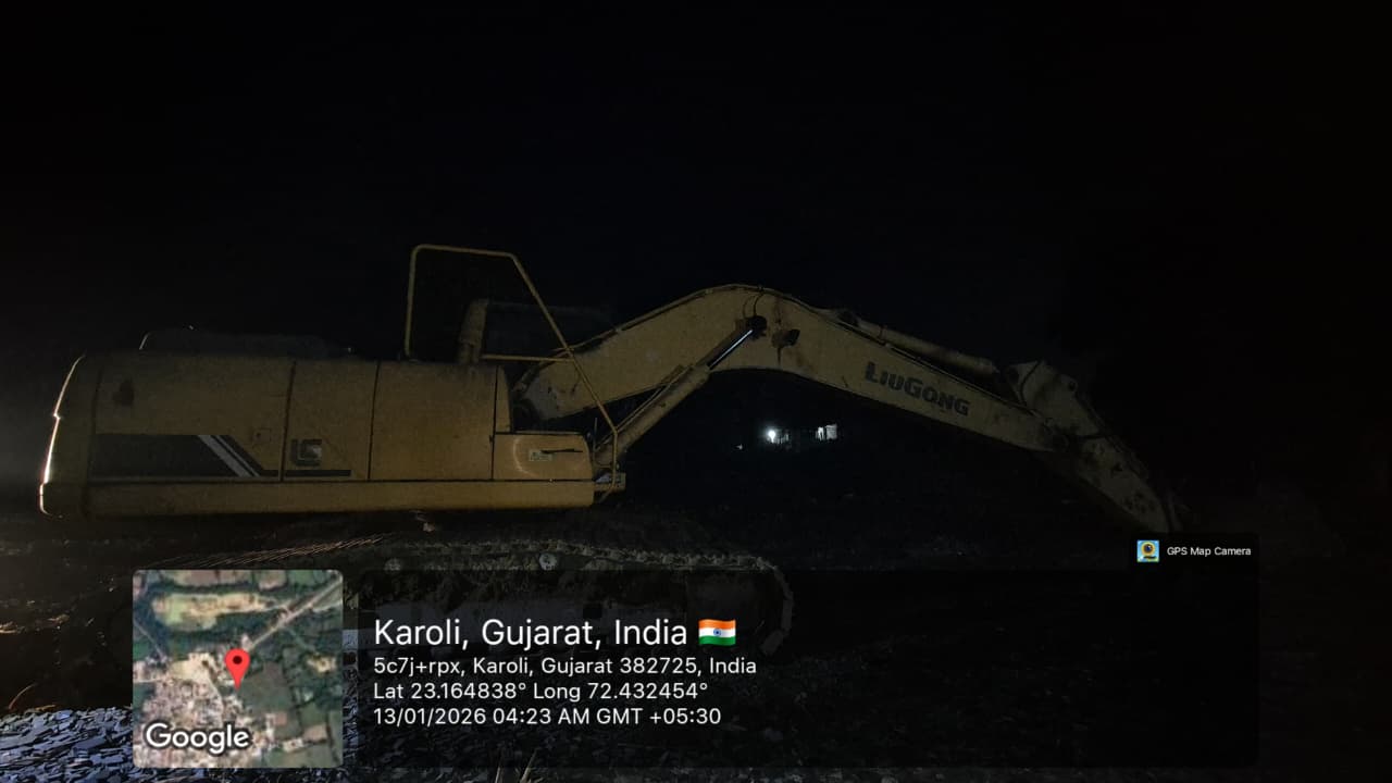 જાન્યુઆરી કલેક્ટરશ્રી ગાંધીનગર મેહુલ દવેના માર્ગદર્શન અને મદદનીશ ભૂસ્તરશાસ્ત્રી પ્રણવ સિંહની સૂચના હેઠળ ગાંધીનગર જિલ્લાના મદદનીશ ભૂસ્તરશાસ્ત્રીની કચેરી, ભૂસ્તર વિજ્ઞાન અને ખનિજ ખાતાની ક્ષેત્રિય તપાસ ટીમ દ્વારા બિન-અધિકૃત ખનન, વહન તથા સંગ્રહ સામે સઘન કાર્યવાહી હાથ ધરવામાં આવી હતી. આ કામગીરી મધ્યરાત્રિના સમયે ઘોર અંધારામાં મોજે-કારોલી, તા. કલોલ, જી. ગાંધીનગર ખાતે આવેલ તળાવ વિસ્તારમાં આકસ્મિક તપાસ કરવામાં આવી હતી. તપાસ દરમિયાન તળાવ વિસ્તારમાં સાદી માટી ખનિજનું તાજું ખોદકામ થયેલું હોવાનું સામે આવ્યું હતું. તપાસ દરમ્યાન Liugong કંપનીનું પીળા રંગનું એક એસ્કેવેટર મશીન (PIN-LGC922DZEJC109236) સ્થળ પર મળી આવ્યું હતું.