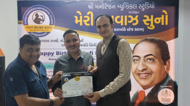 મહાન પાશ્વગાયક સ્વશ્રી મોહમ્મદ રફી સાહેબની ૧૦૧-મી જન્મ જયંતી નિમિત્તે સ્વરાંજલી આપવા માટે શ્રી મનોરંજન મ્યુઝિકલ સ્ટુડિયો આયોજીત “મેરી આવાઝ